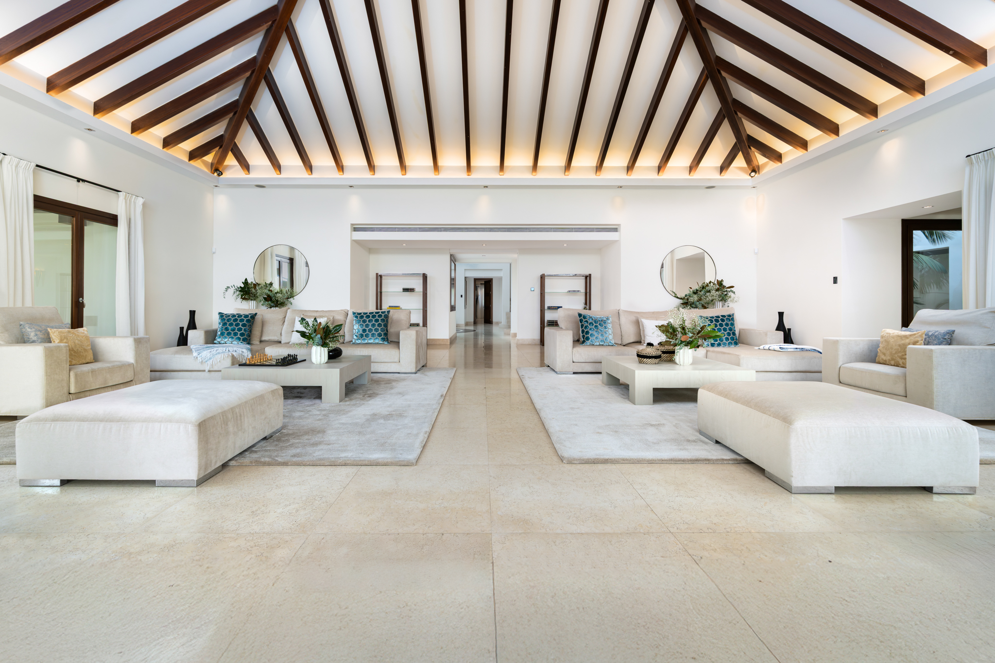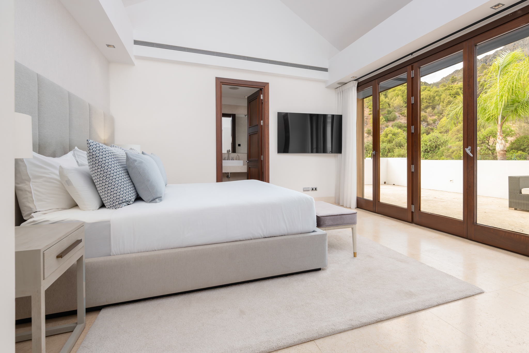 Six bedrooms, each with private en-suite bathrooms, accommodate up to 12 guests. The magnificent master suite includes a private lounge area and expansive terrace with sunrise Mediterranean views.
